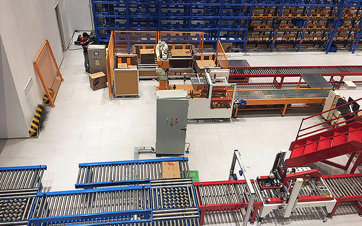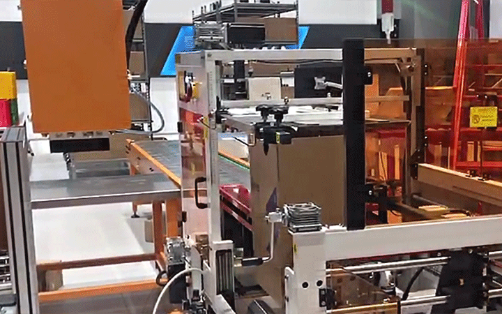 自動拆箱機自動完成開箱、成形、下底折葉折曲。并現(xiàn)時完成下部分膠帶粘貼,將疊成紙板的箱板自動打開,箱子底部按一定程序折合,并用膠帶密封后輸送給裝箱機的專用設備。