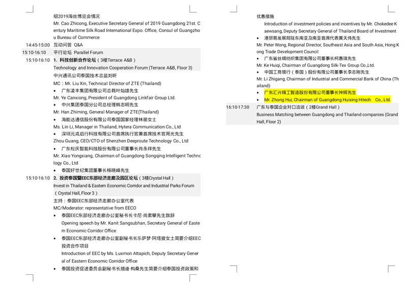 交流會(huì)上進(jìn)行粵港澳大灣區(qū)與泰國合作發(fā)展研討暨廣東省企業(yè)未來發(fā)展計(jì)劃介紹,廣東省商務(wù)廳副廳長陳越華先生作主持。廣東省發(fā)展與改革委員會(huì)主任、推進(jìn)粵港澳大灣區(qū)建設(shè)領(lǐng)導(dǎo)小組辦公室主任葛長偉先生帶來《共享粵港澳大灣區(qū)發(fā)展新機(jī)遇、推動(dòng)廣東與泰國合作發(fā)展》的主題分享,珠海格力電器股份有限公司董事長董明珠女士、科大訊飛科大訊飛股份有限公司高級(jí)副總裁杜蘭女士介紹企業(yè)未來在泰國合作發(fā)展及投資計(jì)劃。交流會(huì)還進(jìn)行《粵港澳大灣區(qū)建設(shè)背景下粵港與泰國合作發(fā)展機(jī)遇》研討沙龍環(huán)節(jié),與泰國政商界代表共同探討促進(jìn)廣東和泰國雙方的交流與合作。