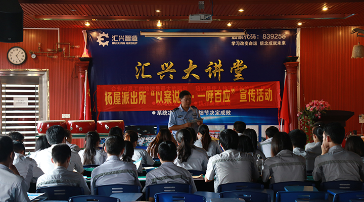 為進一步增強廣東匯興精工智造股份有限公司(股票代碼:839258)全體員工的自我保護意識,提高自我防范能力,預防和減少詐騙跟盜搶性案件的發(fā)生, 7月29日下午,匯興智造特邀楊屋派出所民警走進企業(yè),為全體員工開展“防騙、防搶”安全知識講座。公司全體辦員工代表共計40人在匯興學校聆聽精彩的講座。