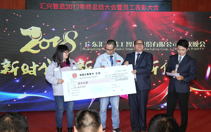 2017年,匯興智造設(shè)立了愛(ài)心慈善基金會(huì),為家庭生活異常困難的員工及其家屬奉獻(xiàn)愛(ài)心。在晚會(huì)現(xiàn)場(chǎng),家庭遇到極大困難的五名員工接受了愛(ài)心捐贈(zèng)。只要人人都獻(xiàn)出一點(diǎn)愛(ài),世界將變成美好的人間。在場(chǎng)的所有人無(wú)不被這一善舉感動(dòng)拭淚。