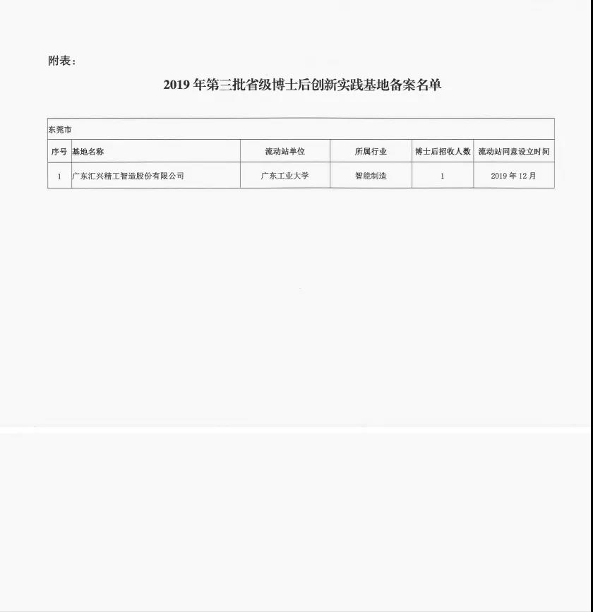 歲序剛翻新,喜訊緊相隨。日前,廣東匯興精工智造股份有限公司(簡稱:匯興智造)成功通過廣東省人力資源和社會保障廳備案,與廣東工業(yè)大學合作建立“省級博士后創(chuàng)新實踐基地”,為博士后科研平臺建設再添“生力軍”。