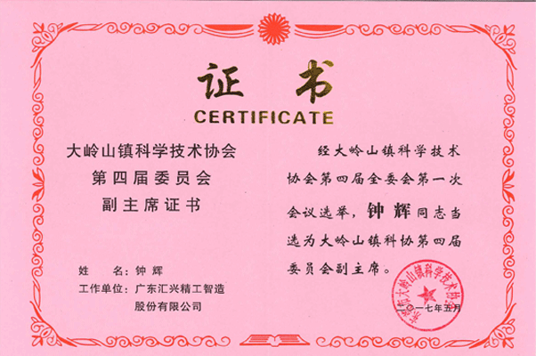 匯興智造鐘董任命大嶺山鎮(zhèn)科學(xué)技術(shù)協(xié)會副主席證書